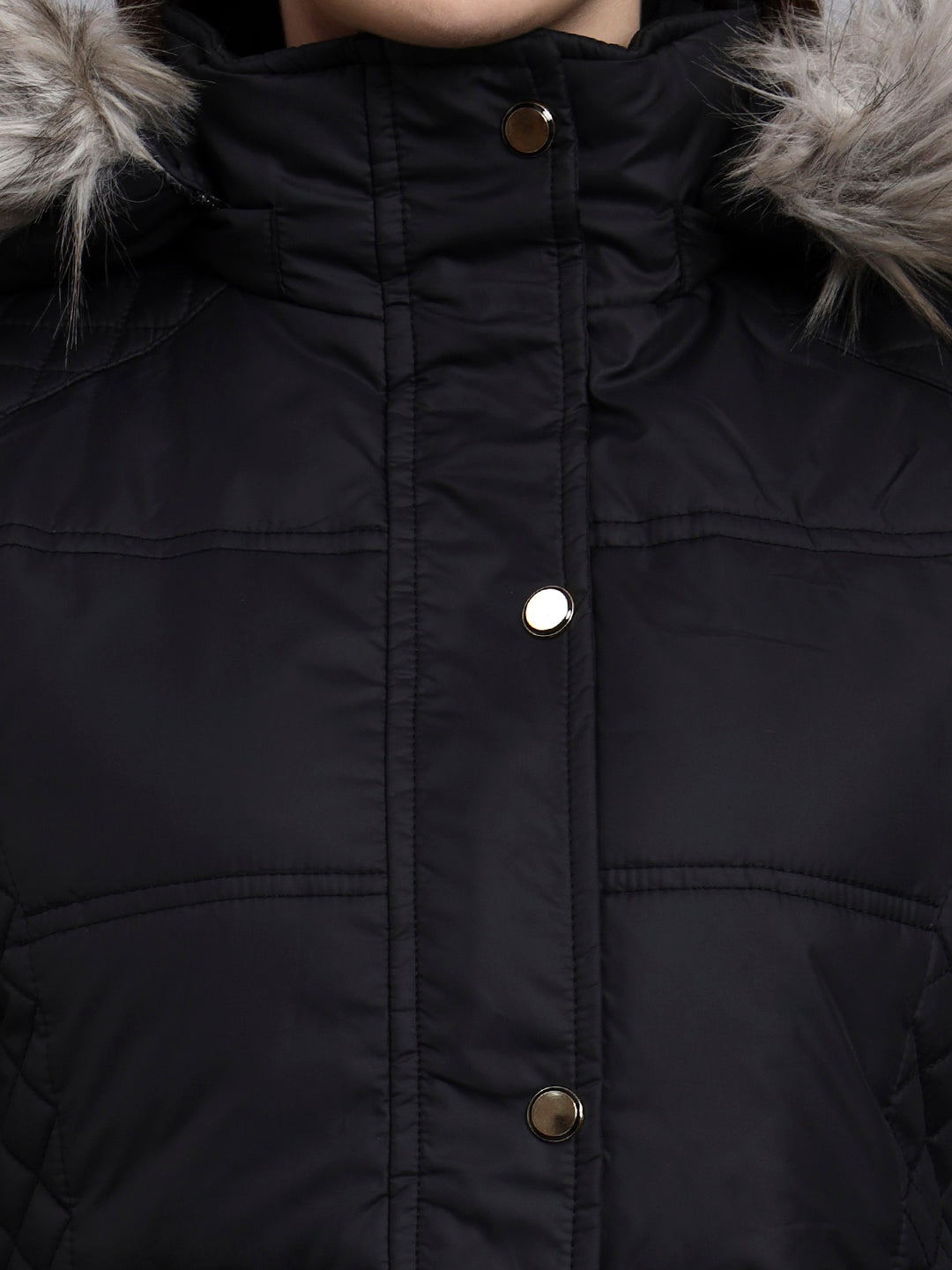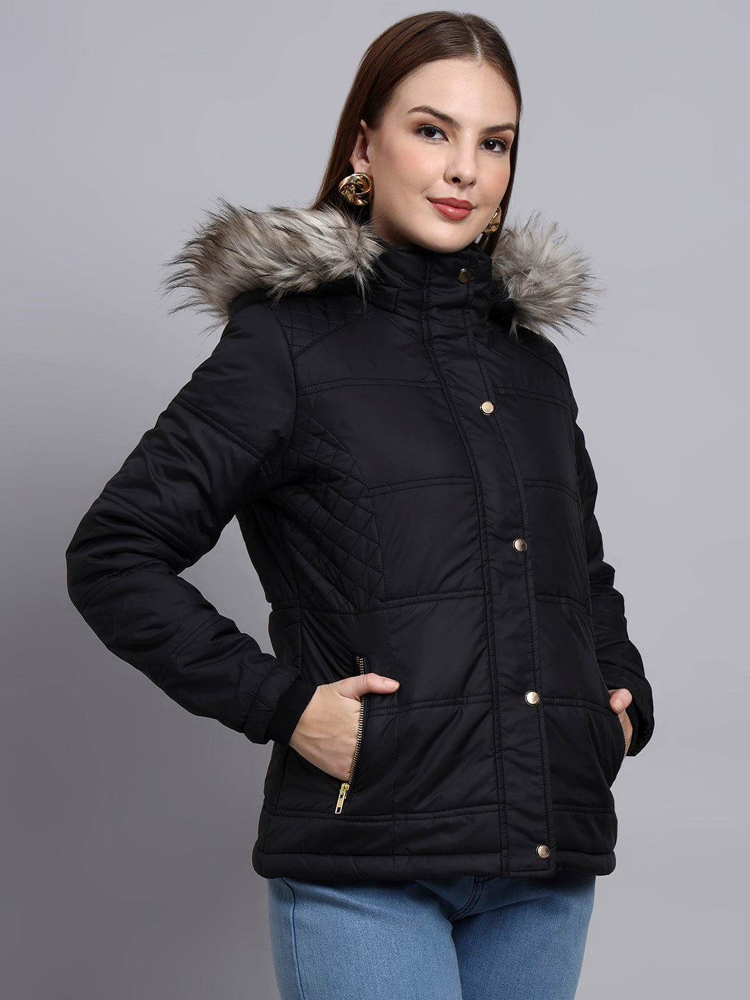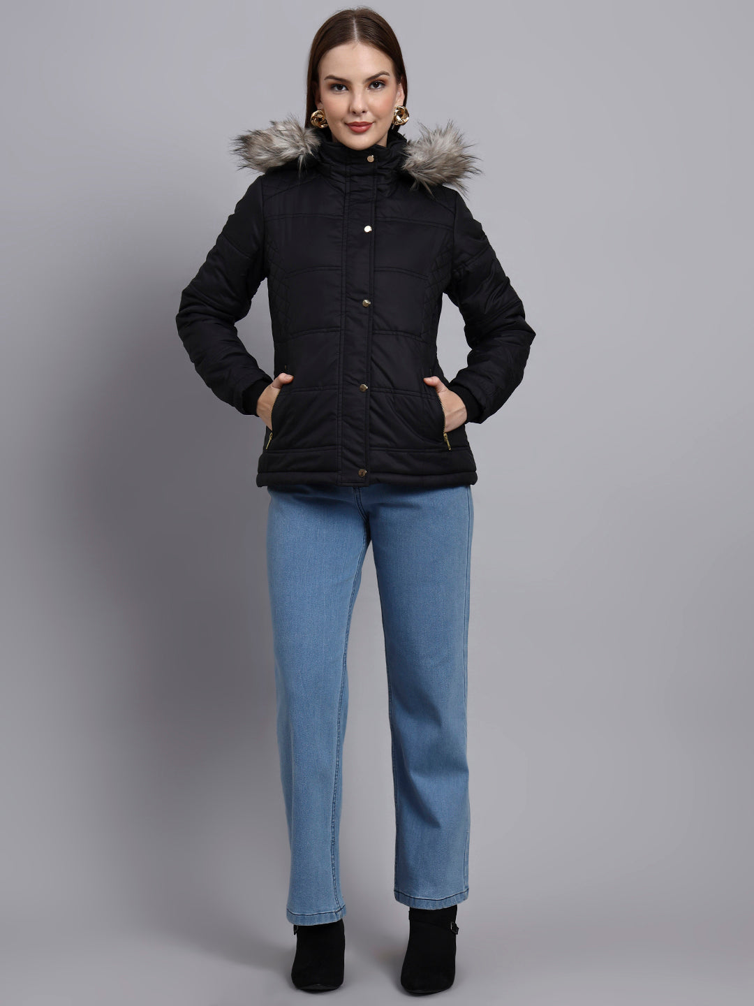 SHORT JACKET WITH , SNAP BUTTON PLACKET AND DETACHABLE HOOD FOR A STYLISH WINTER LOOK