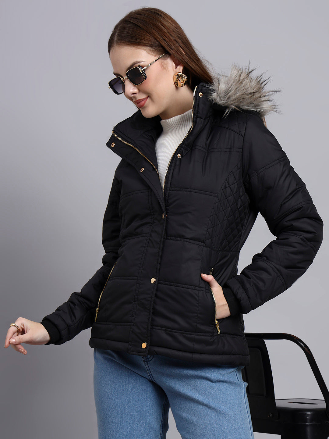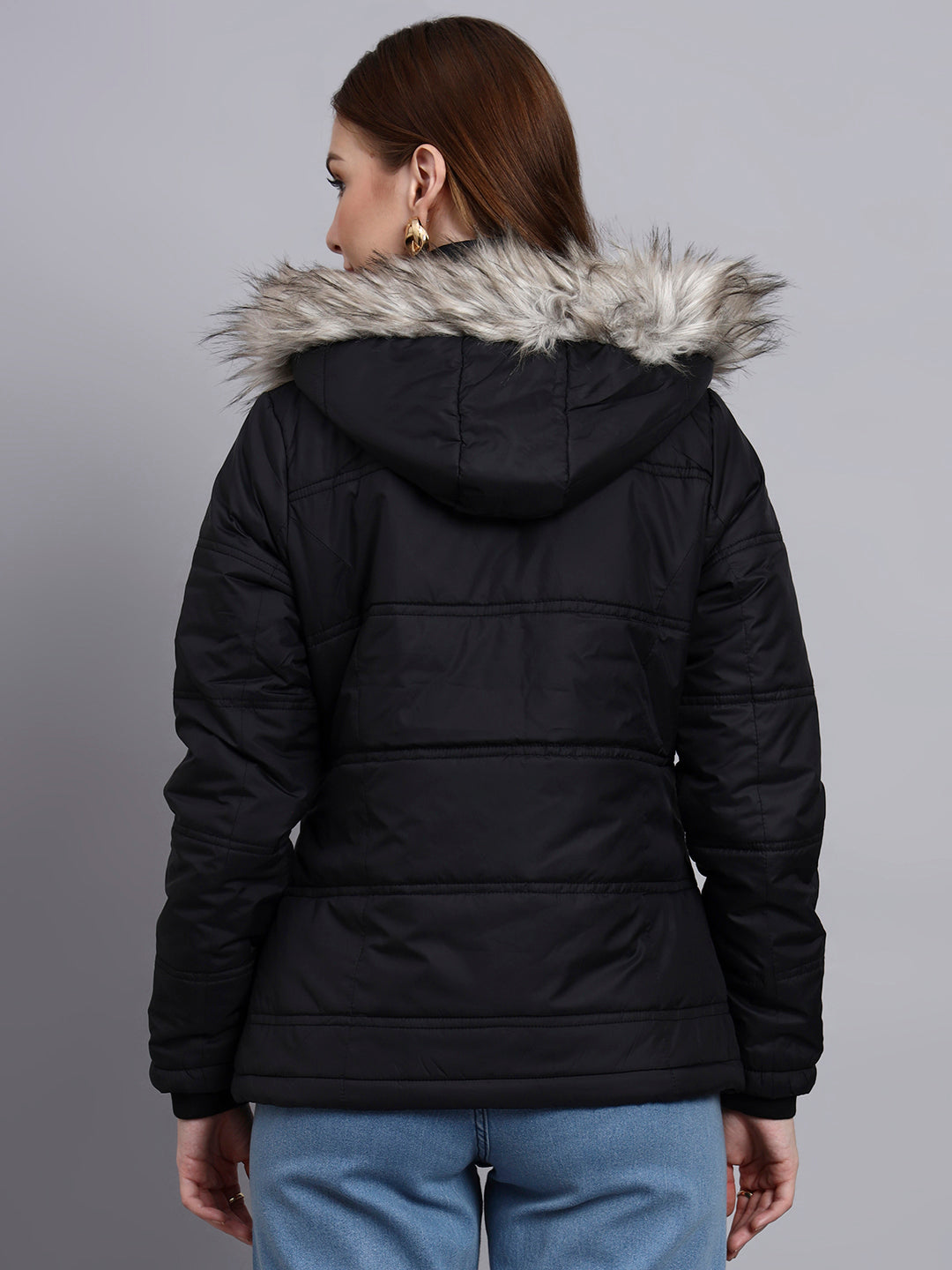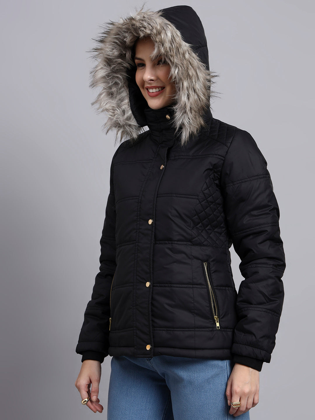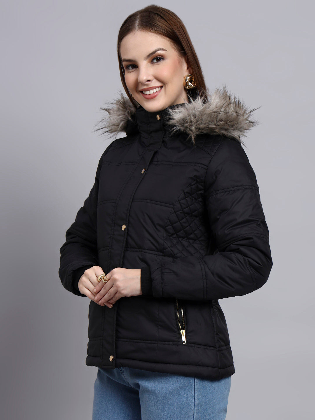 SHORT JACKET WITH , SNAP BUTTON PLACKET AND DETACHABLE HOOD FOR A STYLISH WINTER LOOK