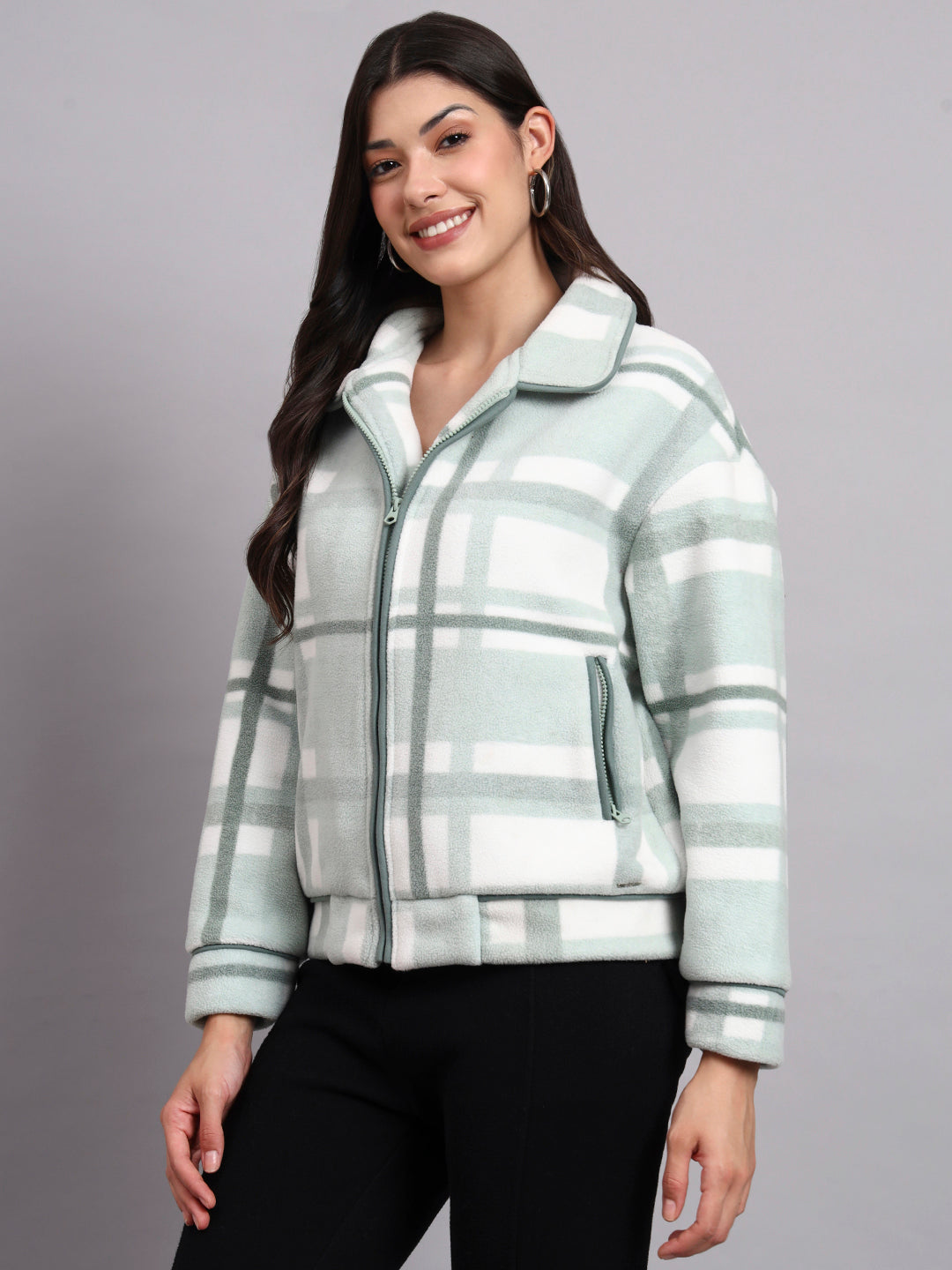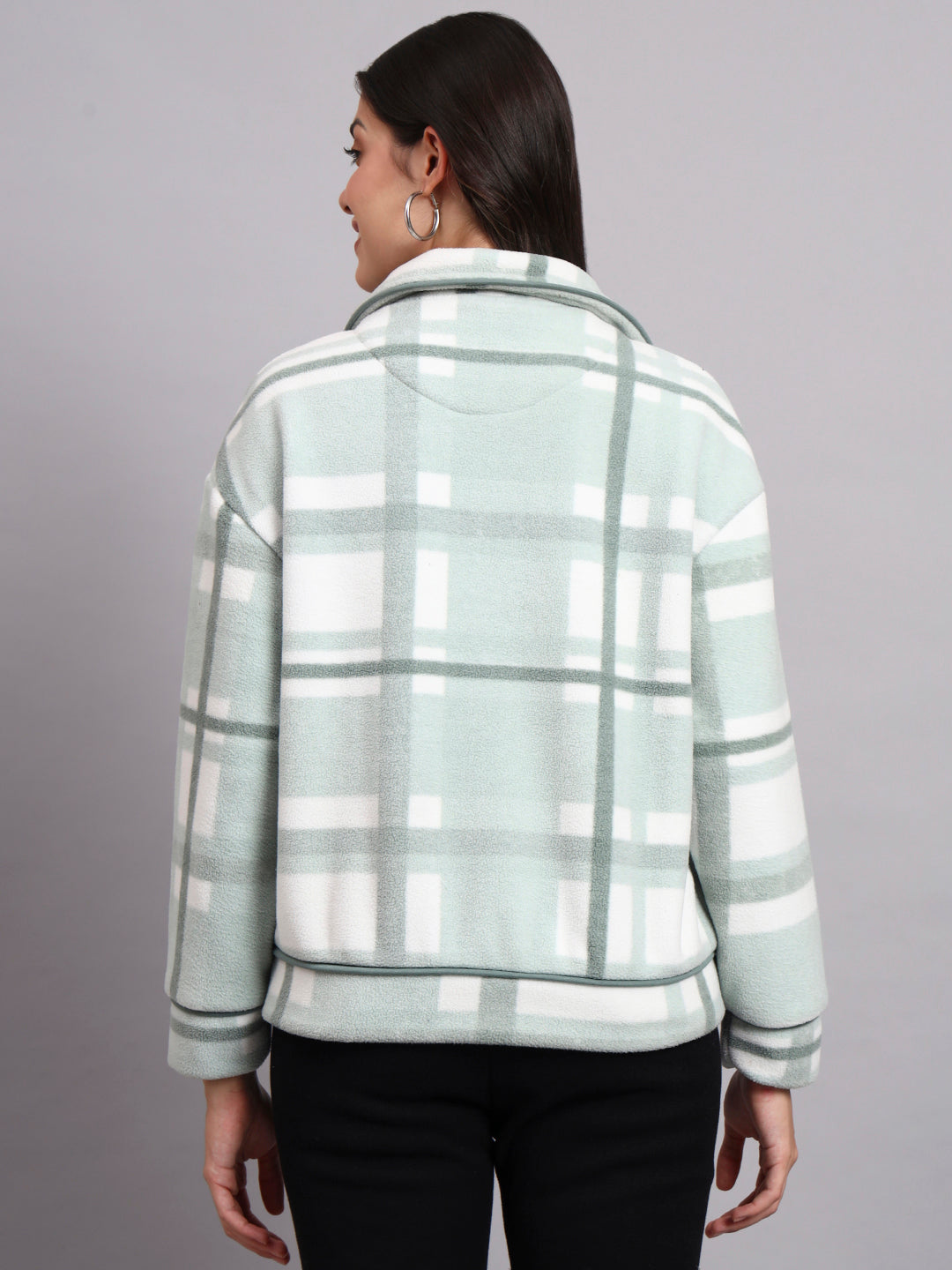 MINT AND WHITE CHECK ZIP UP WITH COLLAR , SIDE POCKETS AND RELAXED FIT.